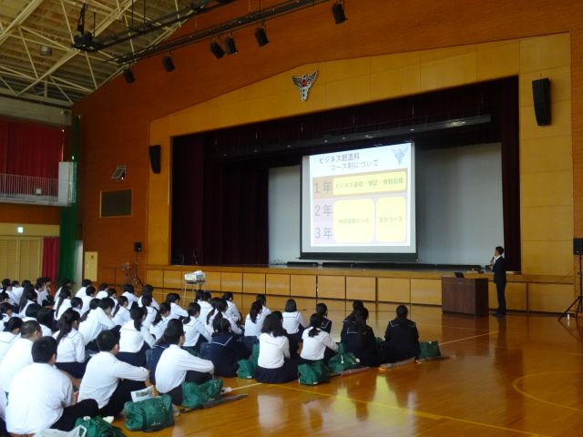 オープンスクールを実施しました。商業教育、進路状況の説明や生徒会による学校紹介バトン部による演技、簿記や情報処理の授業体験を行いました。